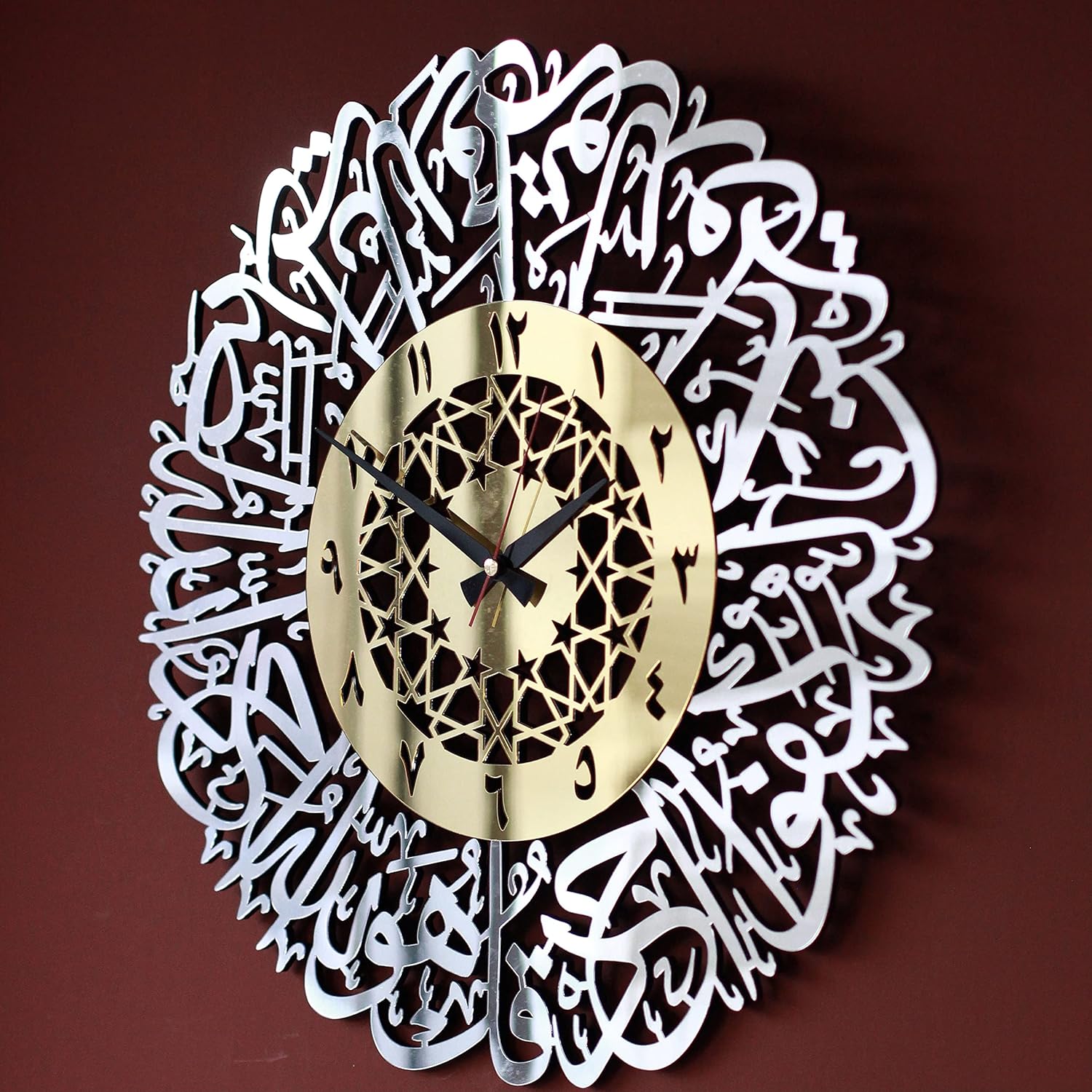 Wooden Acrylic Ikhlas Clock Wall Decor is a well known calligraphy which has an elagance look . It can be also matched with other decors in our store. It is made of MDF with Shiny Acrylic Finish . MDF and the acrylic mirror are cut seperately with laser machines and attached together carefully. This application makes the decor very shiny and elegant looking. The clock has a silent mechanism and it is very easy to hang.You will only need to hang it from the hanging attachments on the mechanism at backside. A few tiny nails will be sent in your package. We offer modern and elegant alternatives instead of old fashionad decors that do not reflect the beauty of calligraphy and we offer the most precious arts that can be gifted to your Muslim friends or family. The most meaningful alternative for wedding, birthday, mother's day, father's day, eid, ramadan or housewarming gift.